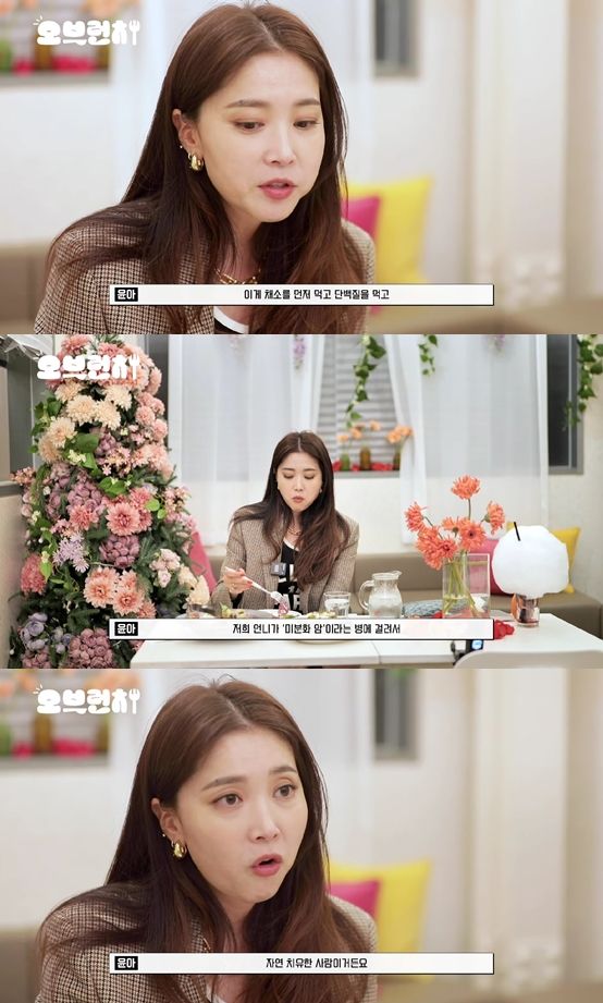 오윤아는 샐러드를 먹던 중 "저희 언니가 그러는데 채소를 먼저 먹고 단백질을 먹고 탄수화물을 먹는 것이 몸에 가장 좋다더라"라고 설명했다.