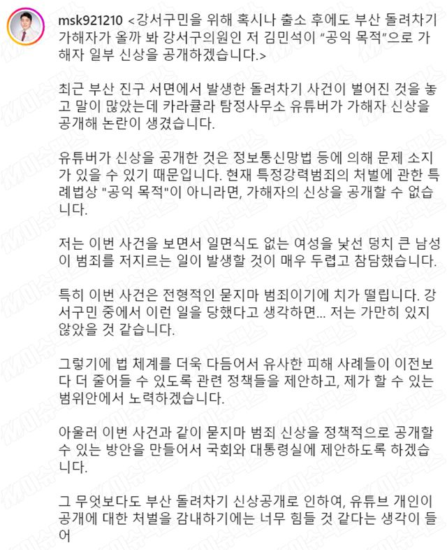 김민석 의원은 부산 돌려차기 가해자 얼굴 사진과 이름, 나이, 출생지, 체격, 전과 등 신상정보를 공개하며 이유를 밝혔다.