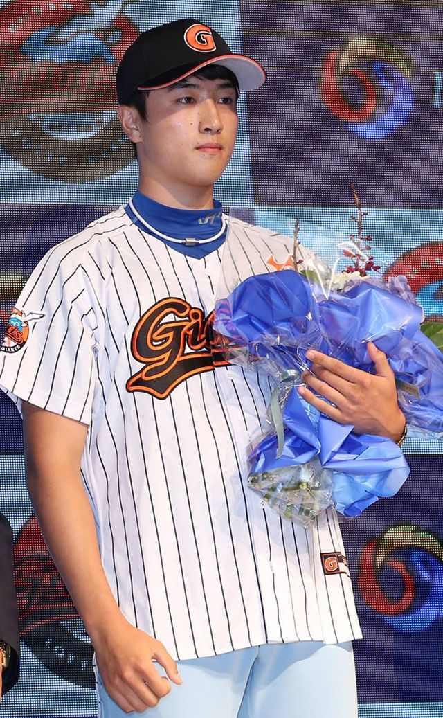 2015년 8월 24일 서울 양재동 더케이호텔 그랜드볼룸에서 열린 2016 KBO 신인 드래프트 1차에서 롯데에 지명된 부산고 투수 박선우가 유니폼을 입고 기념 촬영을 하고 있다. / 연합뉴스