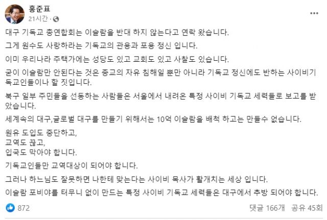 홍 시장은 해당 교회와 달리 "대구 기독교 총연합회는 이슬람을 반대하지 않는다고 연락 왔"다며 "그게 원수도 사랑하라는 기독교의 관용과 포용 정신"이라고 전했다.