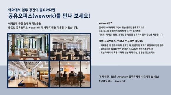 먼저, 현대차는 세계적인 공유오피스 위워크(WeWork)와 손잡고 6월부터 해외 출장자들이 전 세계 출장지에서 위워크가 운영하는 공유 오피스를 이용할 수 있도록 했다. 기아는 제도 도입을 검토하고 있다.
