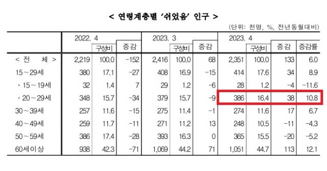 정부가 지난달 발표한 4월 고용동향 자료에서 특히 눈에 띈 건 '쉬었음' 인구의 증가세다. 4월 전체 비경제활동인구 1613만5000명 가운데 '그냥 쉬었'던 인구는 235만1000명이었다. 전년동월대비 13만3000명(6.0%) 증가했다.