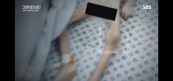 환자 인식 밴드조차 헐렁할 정도로 마른 다리. 특히 무릎이 튀어나와 있다.