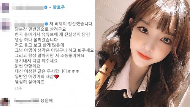 지난 3월 BJ 아영 인스타그램에는 “비제이 청산했다. 당분간 일반인으로 살려고 한다. 한국에 돌아가서 유튜브에 제 진실성이 담긴 영상 하나 올리겠다”라며 활동을 중단한 바 있다.