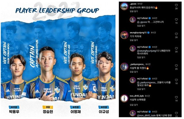 이날 게시글에 등장한 정승현(주장)·박용우·이규성·이명재(이상 부주장)는 울산 구단 주장단을 맡고 있습니다. 박용우와 정승현은 이번에 국가대표에도 발탁됐습니다.