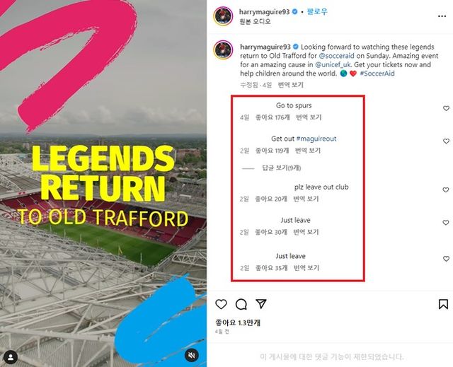 맨유 팬들도 마찬가지다. 매과이어 SNS를 찾아 "제발 클럽을 떠나라", "토트넘으로 가", "다른 곳에선 더 많이 뛸 수 있잖아", "우린 널 필요로 하지 않아"라고 촉구했다. 매과이어를 둘러싼 상황이 복잡하게 흘러가고 있다.
