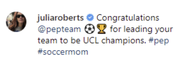 영국 더선은 12일 "과르디올라와 줄리아 로버츠의 오프라인 로맨스가 마침내 시작됐다"며 "로버츠가 과르디올라의 마음을 아프게 한지 7년 만에 축하글을 올렸다"고 보도했다.