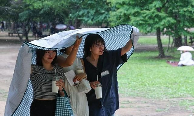 소나기가 내린 지난 6일 오후 서울 성동구 서울숲에서 휴식하던 시민들이 갑자기 내린 비에 돗자리를 우산 삼아 쓰고 이동하고 있다. [사진=연합뉴스]