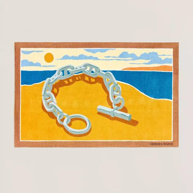 배를 닻에 연결하는 사슬 연결고리에서 영감받은 에르메스의 아이코닉 한 브레이슬릿 프린트가 크게 장식된 테리 클로스 소재의 타월. 낮과 밤, 달라지는 시간에 따라 모래 위에서 빛을 받는 앵커 체인을 묘사했다. 뒷면은 에르메스의 아이덴티티를 상징하는 오렌지 컬러가 특징. 비치 위에서 더욱 빛을 발할 듯!