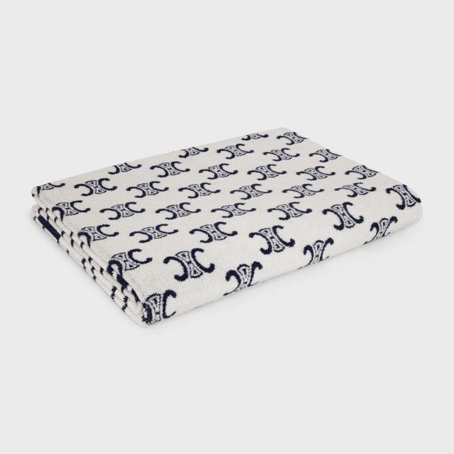 두툼한 아이보리 코튼 위 네이비 컬러의 트리옹프 로고 플레이로 시크함을 더한 셀린느 비치타월. 모노그램 자카드로 고급스러움과 깔끔함 두 가지를 모두 놓치지 않았다. 같은 디자인의 비치 필로우도 구성되어 있어 해변에서의 나른한 한때를 보내기에 최적의 아이템이 되어준다.
