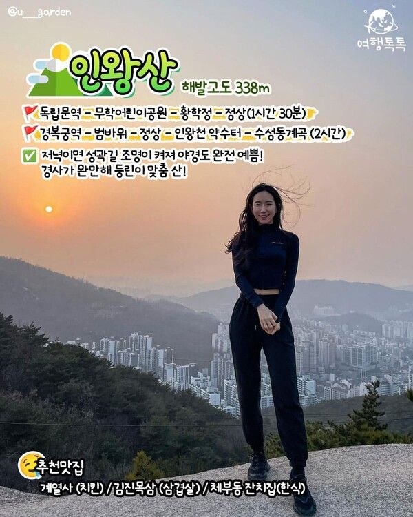 인왕산은 높이 338.2m의 산으로 높지 않아 등산 초보자에게 입문 산으로 추천되는 산입니다. 지하철 3호선 경복궁역 1번 출구에서도 가까워 뚜벅이 등산객들에게도 적합한 산이기도 합니다. 등산로 대부분이 성곽길로 편하며 밤이 되면 성곽길을 따라 조명이 켜져 서울의 야경 명소로도 꼽힙니다.