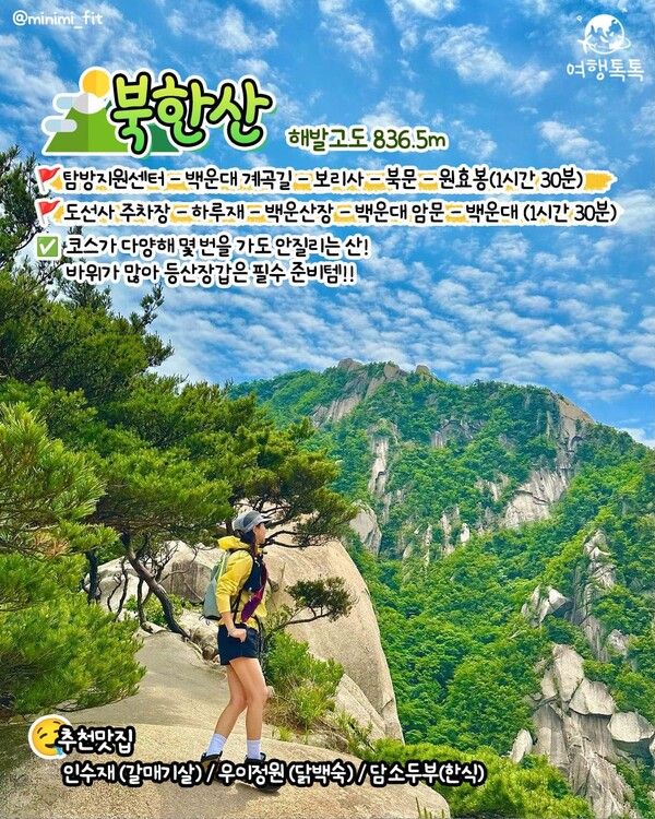 북한산은 코스가 다양해 몇번을 방문해도 색다른 등산이 가능해 여러 매력을 갖고 있는 산으로도 유명한데요. 추천드리는 코스는 초보 등산객을 위한 코스로 각각 원효봉, 백운대가 목적지인 코스로 준비했습니다.