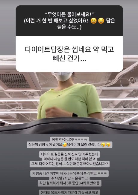 이어 "방송 나간 이후에 돼지라는 악플에 충격 받고ㅋㅋㅋ 주 4~5일 2시간씩 운동하고 식단 철저하게 해서 6주 동안 3~4키로 뺐어요"라며 다이어트를 결심하게 된 계기를 밝힌 그는, "현재도 목표가 있기 때문에 계속 하고 있고 여름이라서 더 의지가 불끈"이라며 앞으로도 체중 조절 계획이 있다고 밝혔다.