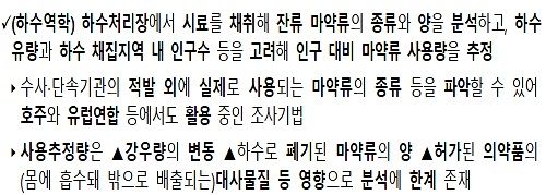 3년간 연속적으로 조사된 34개 하수처리장에서는 조사대상 불법마약류 7종 중 5종[필로폰(메트암페타민), 암페타민, 엑스터시(MDMA), 코카인, LSD]이 한번이라도 검출된바 있다.