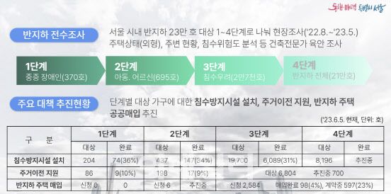 서울시가 밝힌 자료에 따르면 지난해 8월부터 올해 5월까지 반지하 23만호를 대상으로 현장조사를 실시했다. 1단계(중증장애인·370호), 2단계(아동/어르신·695호), 3단계(침수우려 가구·2만7000호), 4단계(나머지 반지하 전체·21만호)로 나눠 조사한 결과를 바탕으로 단계별 대상 가구에 대한 침수방지시설 설치, 주거이전 지원, 반지하 주택 공공매입을 추진할 계획이다.