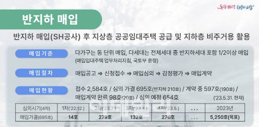 한병용 서울시 주택정책실장은 “올해 안에 반지하 1050호를 매입 할 예정이고, 이주 등에 필요한 지상부 주택까지 포함하면 5250호를 사들일 예정이”라면서도 “반지하 하나로만 대책을 세우긴 어렵고, 정비사업으로 멸실되는 반지하 숫자도 많다. 모아주택, 모아타운 등을 선정할 때 반지하가 포함되는 경우 가점을 주는 등 여러 방향으로 정책을 시행해 나갈 것”이라고 말했다.