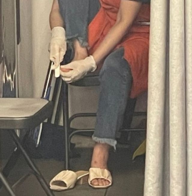 게시글에 첨부된 사진에는 점주로 추정되는 인물이 매장 구석에서 장갑을 낀 채 손톱버퍼로 발 각질을 제거하고 있다. 그러면서 "키오스크로 커피를 결제하고 기다리는데 안에서 발 각질을 정리하던 분이 갑자기 나와서 커피를 제조했다"며 "신경 안쓰려고 했지만 발 각질 가루가 커피에 들어간 느낌"이라고 설명했다.