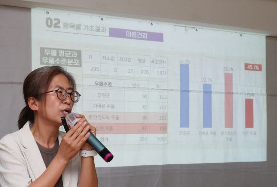 13일 오전 서울 종로구 서울대병원 장례식장에서 열린 ‘경찰 소환조사 건설노조원 심리적 위기 긴급조사 발표 기자간담회’에서 두리공감 상임활동가 장경희씨가 실태조사 결과를 발표하고 있다.(사진=연합뉴스)