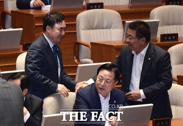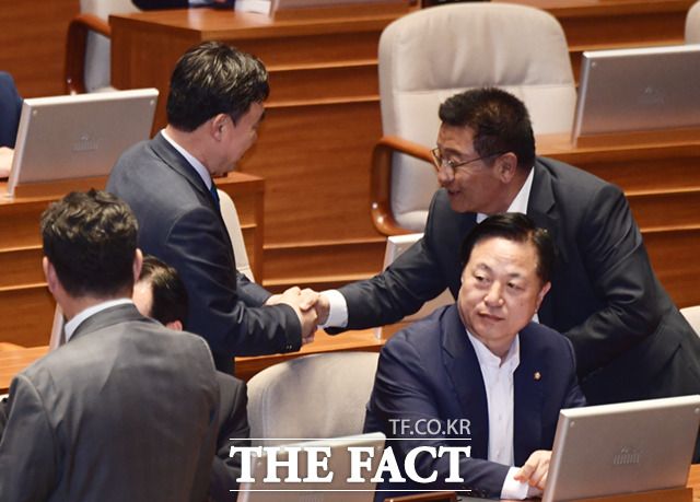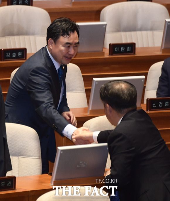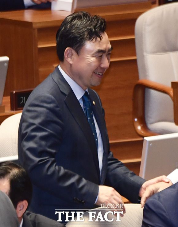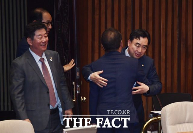 [더팩트ㅣ국회=이새롬 기자] 전당대회 돈봉투 의혹으로 전날 체포동의안이 부결된 윤관석 의원이 13일 오후 서울 여의도 국회에서 열린 본회의에 참석해 동료 의원들과 포옹하고 있다.