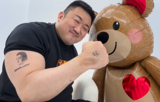 공개된 영상 속 마동석은 곰돌이 풍선 옆에서 큰 팔뚝을 자랑하고 있다.