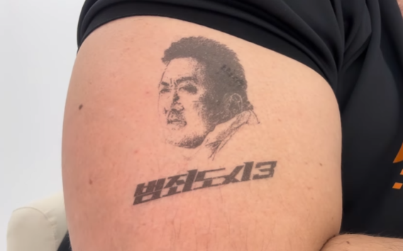 클로즈업이 된 팔뚝에는 마동석이 '범죄도시3'에서 맡은 마석도 역할의 얼굴과 '범죄도시3' 글씨가 새겨져 있어 눈길을 끈다.