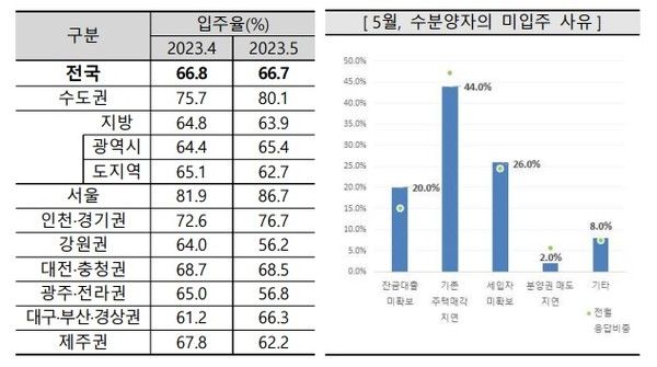 이러한 미입주 원인은 ▲기존 주택 매각지연(44.0%) ▲세입자 미확보(26.0%) ▲잔금대출 미확보(20.0%) 순으로 조사됐다. 주산연은 전세퇴거자금대출 규제 폐지, 시중은행의 대출금리 인하 등 대출환경 개선으로 잔금대출 미확보 응답 비중은 점차 낮아질 것이라는 전망을 내놨다.