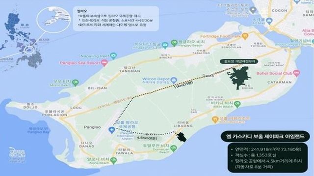 위치 접근성도 우수하다. 엘 카스카디 제이파크 보홀은 보홀 부속섬인 팡라오에 들어서는데, 사업지에서 8분 거리(4.5km)에 팡라오 국제공항이 위치하고 있다.