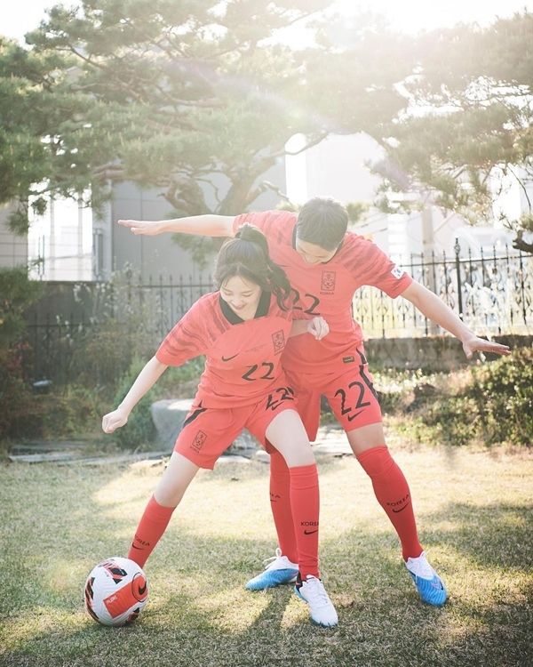 이하 축구 유니폼을 입고 웨딩 화보를 찍고 있는 권창훈, 이수날