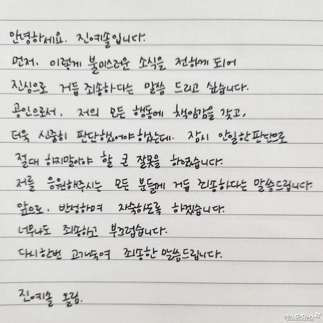 그는 사과문을 통해 "공인으로서 저의 모든 행동에 책임감을 갖고 더욱 신중히 판단했어야 했는데 잠시 안일한 판단으로 절대 하지 말아야 할 큰 잘못을 했다며 "앞으로 반성하며 자숙하도록 하겠다"고 전했다.
