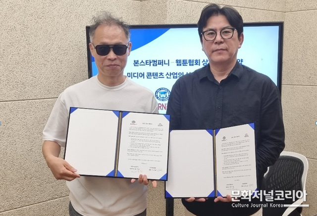 문화저널코리아 김영일 기자 | 사단법인 웹툰협회(회장 전세훈)와 본스타컴퍼니(대표 홍기성)가 업무 협약식을 체결하여, 웹툰 작가들의 2차 저작권 지적재산권 사용, 글로벌 공략 드라마, 영화, KPOP 작품 기획, 제작 사업 협력 계약을 체결했다.