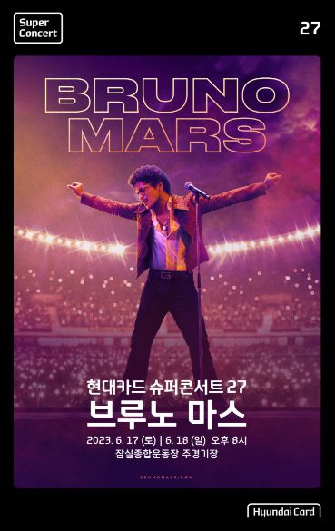 브루노 마스는 17일과 18일 서울 잠실종합운동장 주경기장에서 '현대카드 슈퍼콘서트 27 브루노 마스(Bruno Mars)'를 개최한다.
