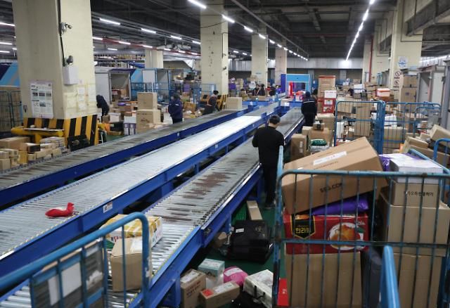 한진 남서울종합물류센터에서 관계자들이 택배 배송지 분류 작업을 하고 있다. [사진=연합뉴스]