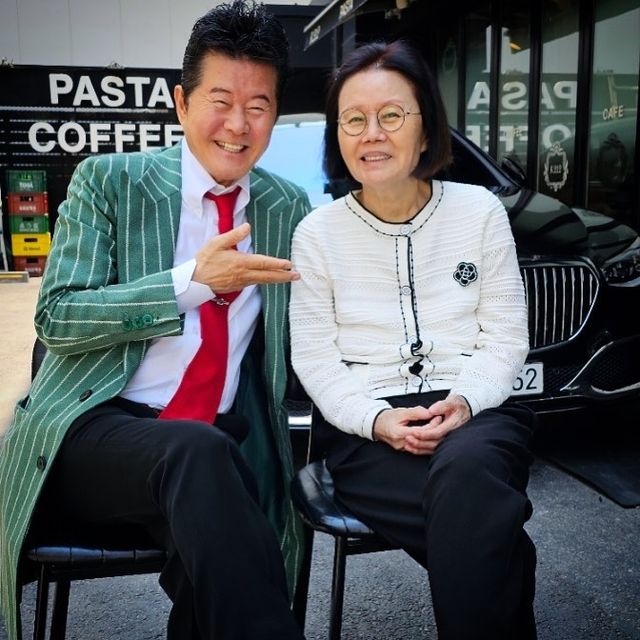 초록색 재킷에 빨간 넥타이를 한 태진아는 환하게 웃으며 아내 이옥형을 가리키고 있다. 흰색 의상을 입은 이옥형 씨도 두 손을 모은 채 웃고 있다.