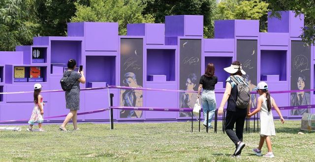 '방탄소년단 10주년 페스타@여의도'를 하루 앞둔 지난 16일 오후 서울 여의도 한강공원에 BTS 관련 조형물이 설치되어 있다.