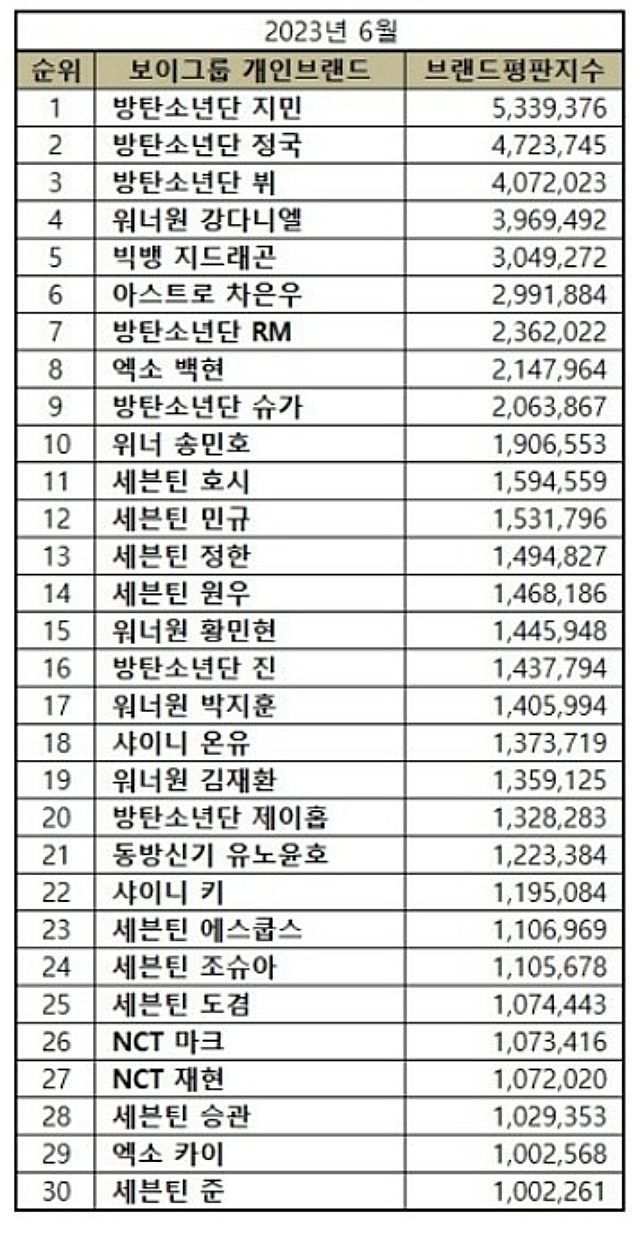 2023년 6월 보이그룹 개인 브랜드평판 상위 30위는 방탄소년단 지민, 방탄소년단 정국, 방탄소년단 뷔, 워너원 강다니엘, 빅뱅 지드래곤, 아스트로 차은우, 방탄소년단 RM, 엑소 백현, 방탄소년단 슈가, 위너 송민호, 세븐틴 호시, 세븐틴 민규, 세븐틴 정한, 세븐틴 원우, 워너원 황민현, 방탄소년단 진, 워너원 박지훈, 샤이니 온유, 워너원 김재환, 방탄소년단 제이홉, 동방신기 유노윤호, 샤이니 키, 세븐틴 에스쿱스, 세븐틴 조슈아, 세븐틴 도겸, NCT 마크, NCT 재현, 세븐틴 승관, 엑소 카이, 세븐틴 준 순으로 나타났다.