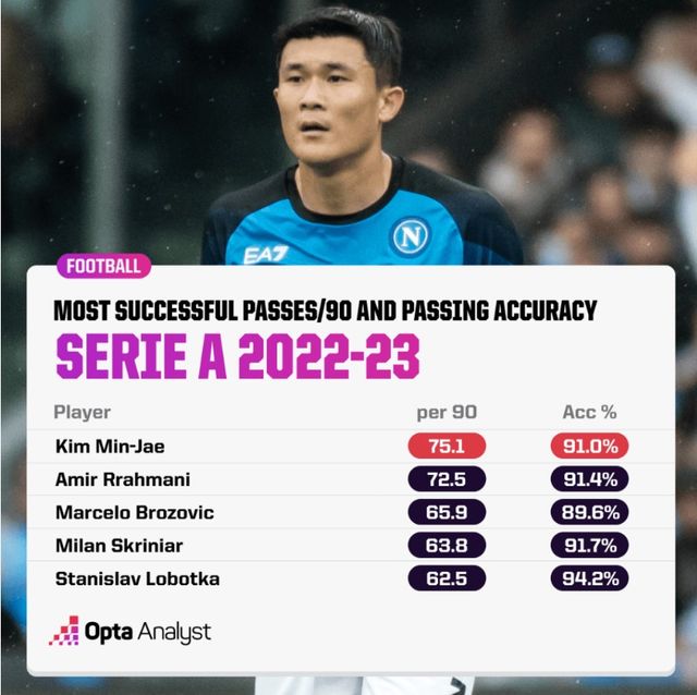 실제로 축구통계매체 '옵타'에 따르면, 김민재는 2022/23시즌 세리에A에서 공중볼 승률이 63%에 이르렀다. 또한 패스 성공률도 수비수임에도 91%나 되면서 무결점 수비수임을 과시했다.