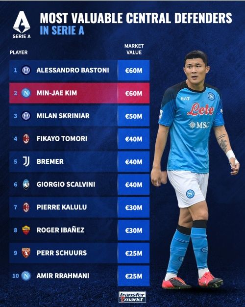'수비의 본고장'이라 불리는 이탈리아 무대에서 대한민국 수비수 김민재가 알레산드로 바스토니(인터 밀란)와 함께 센터백 몸값 1위를 차지했다.