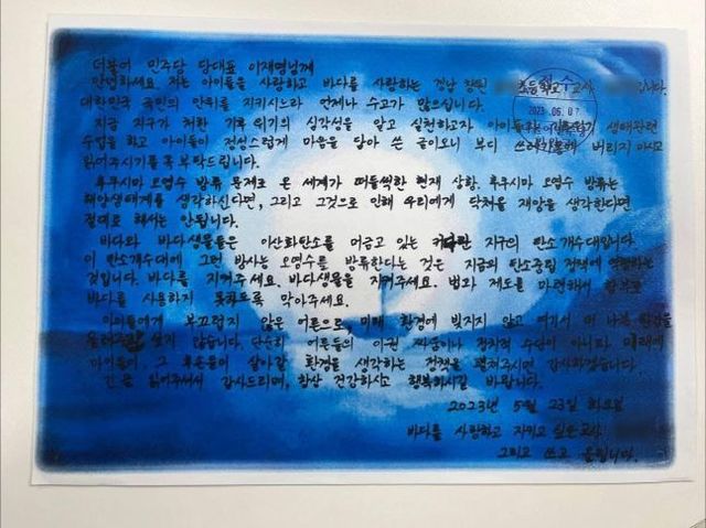 이 대표는 "학생들이 걱정하는 것처럼 바다는 모든 생명을 품어주는 귀한 존재다"라며 "바다가 살 수 없다면 바다에 의지해 사는 모든 생명도 위태로워질 것"이라고 경고했다.