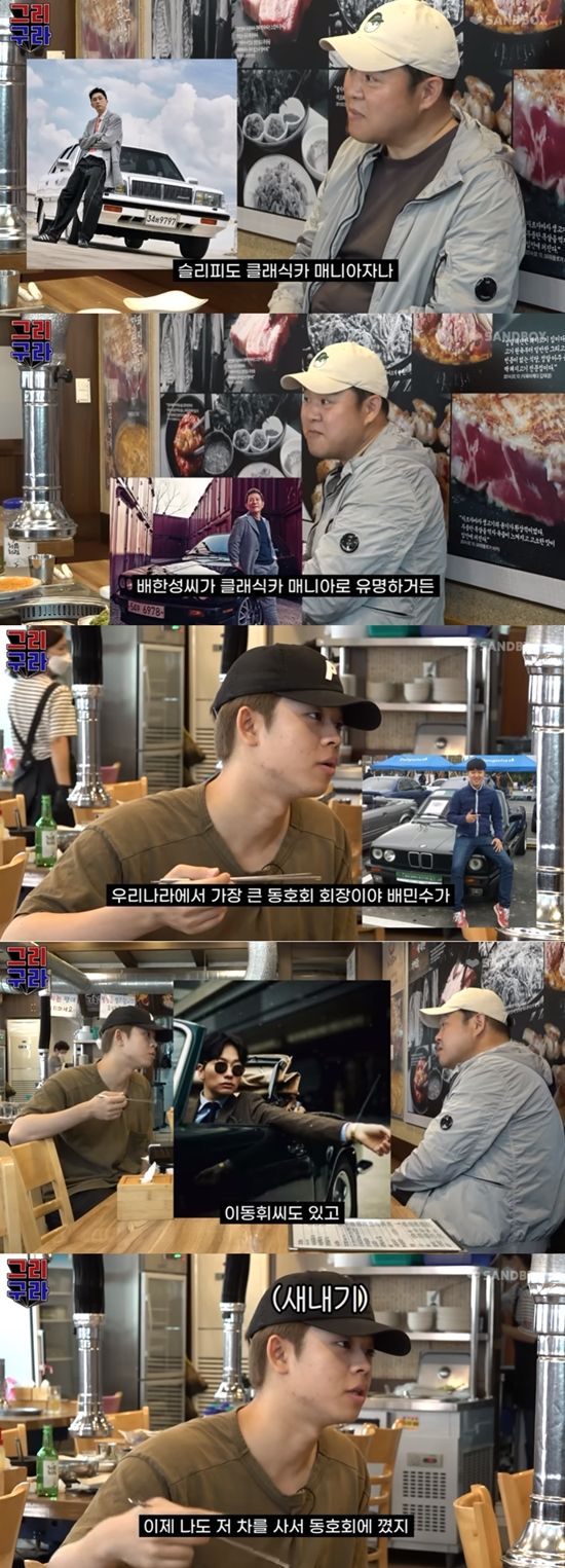 그런가 하면 김구라는 고기가 구워지는 동안, 국내에서 '클래식카 매니아'로 정평이 난 이들을 읊었다. 그는 "슬리피가 클래식카 매니아"라며 "너(그리)는 배한성 씨 아들 배민수의 영향을 받은 거 아니냐. 배한성 씨가 클래식카로 유명하다"고 말했다.