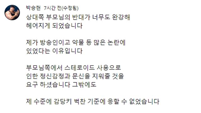 박승현은 18일 유튜브 커뮤니티에 "상대 쪽 부모님의 반대가 너무 완강해 헤어지게 됐다"며 장문을 게재했다.