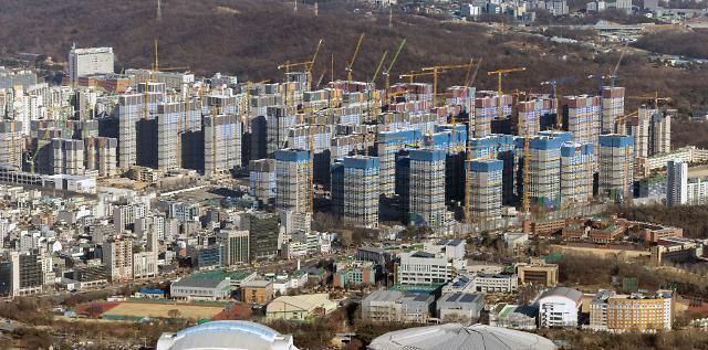 서울 송파구 롯데월드타워 전망대 서울스카이에서 바라본 '올림픽파크 포레온'(둔촌주공) 재건축 공사 현장[사진=유대길 기자 dbeorlf123@ajunews.com]
