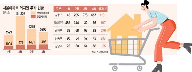 18일 한국부동산원의 ‘월별 매입자거주지별 아파트매매거래 현황’에 따르면 올해 1~4월까지 서울아파트거래 2만 6276건 중 19.8%인 5205건은 서울 거주자가 아닌 외지인이 매입한 것으로 나타났다. 외지인의 서울 아파트 매입건수는 올해 1월 1004건에 그쳤으나 2월 1277건, 3월 1431건, 4월 1493건으로 우상향했다.