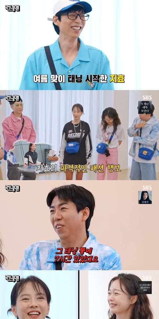 이날의 히트를 송지효였다. 지석진은 송지효가 등장하기 전 "지효를 보고 깜짝 놀랐다"고 말해 궁금증을 높였다. 송지효가 등장하자마자 지석진은 "다리가 너무 탔다. 적당히 태워야지. 쿠키도 이정도 구우면 버린다"고 했고, 김종국은 "지금도 탄내가 나는 것 같다. 육포인 줄 알았다"면서 경악했다. 이에 양세찬은 "태닝 통에 7시간을 있었다고 한다"고 말하면서 놀랐다. 하지만 송지효는 "이 색깔은 금방 빠진다"고 홀로 태연한 모습을 보여 웃음을 자아냈다.