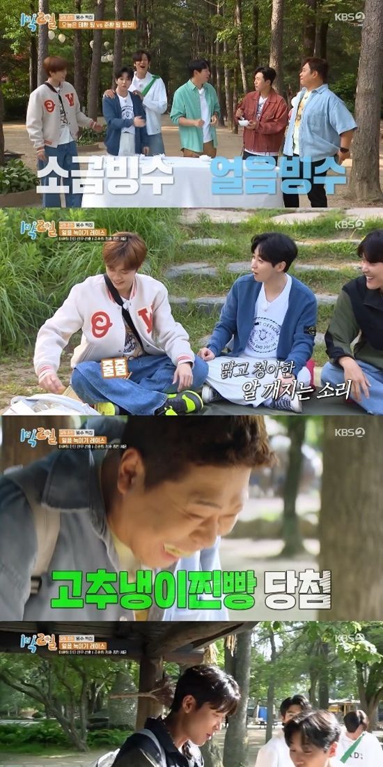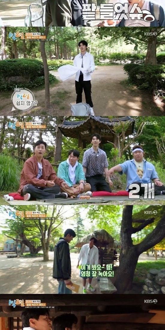 나인우는 정자로 향하더니 갑자기 팀원들을 불러모았다. 미션이 팀미션인 달걀공기였던 것. 유선호를 시작으로 딘딘, 나인우가 모두 실패한 가운데 박태환이 유일하게 한 번 성공했다. 하지만 박태환도 달걀을 깨트리며 최종 실패를 했다. 딘딘은 "이건 안 되는 거다"라며 다른 미션을 찾아 나섰다.