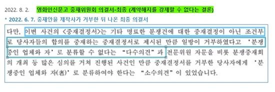 또 "그런데 2021년 10월 갑자기 작가가 캐스팅이 오래 걸린다고 작품을 가지고 나가겠다고 했다. 받아들이지 않자 계약해지를 주장하면서, '영화인 신문고'에 불공정 계약으로 신고했다"면서 "'영화인 신문고'는 2022년 8월 2일 계약해지를 강제할 수 없다는 최종 의결서를 내고 사건을 종결 처리했다"라고 설명했다.