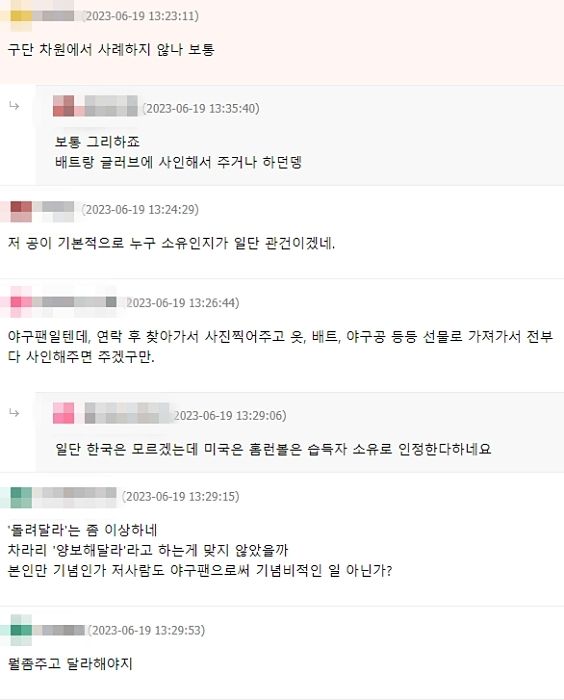여러 네티즌은 커뮤니티 댓글을 통해 "무슨 권리로 돌려달라고 하는 거냐", "저분한테도 홈런볼 받은 건 의미가 있을 텐데...", "공 받은 분을 무슨 범죄자 취급하네", "주운 사람 마음이지", "(돌려주는 게) 당연한 것처럼 하니 좀 어이가 없네", "마치 뺏어간 것처럼 말하네", "그렇게 의미가 있으면 대가를 치르고 가져가든가", "'돌려달라'는 표현은 좀 이상하다"라고 말했다.