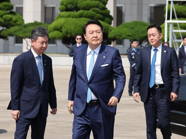 19日,出访法国和越南的韩国总统尹锡悦(中)抵达城南首尔机场,正在前往“空军1号”总统专机。【图片来源 韩联社】