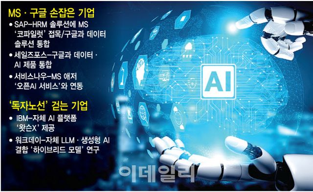 [이데일리 김가은 기자] ‘기업용 생성형 인공지능(AI)’ 시장을 둘러싼 경쟁이 격화되고 있다. 기업간거래(B2B) 영역에서 입지를 다져온 글로벌 기업들이 마이크로소프트(MS)·구글 등과 ‘연합군’을 꾸리고 ‘주도권 싸움’에 나선 것이다.