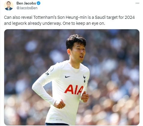 'CBS 스포츠' 소속 벤 제이콥스 기자는 최근 손흥민이 토트넘을 떠나 사우디아라비아로 향할 수 있다고 주장해 눈길을 끌었다.