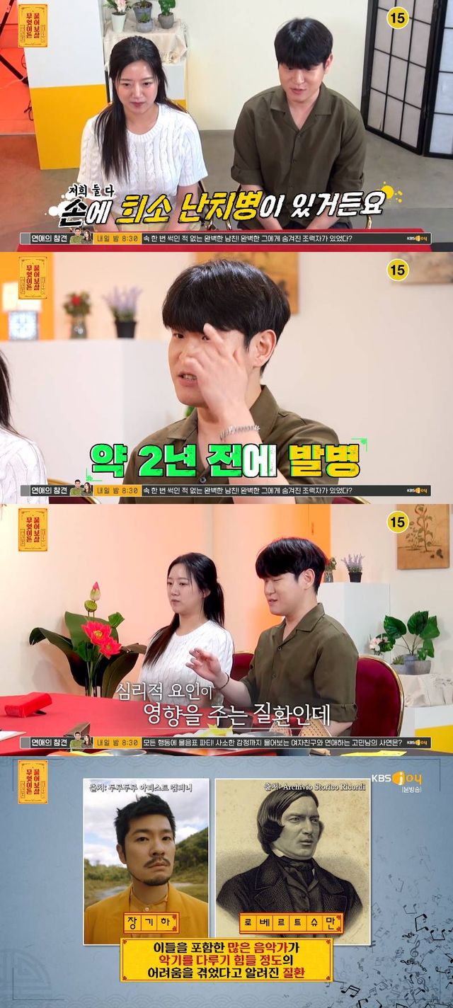 남자 의뢰인은 "심리적인 요인이 영향을 주는 질환이다. 손에 힘이 확 들어간다"고 말했고, 여자 의뢰인 역시 "연주만 하면 그런다"고 답했다.